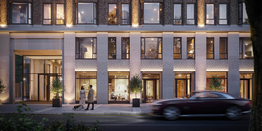 Высокие эркерные окна и использование благородных материалов, таких как натуральный камень и мрамор, добавляют изысканности и статусности зданию. Визуальные акценты на панорамные виды на Москву подчеркивают индивидуальность проекта, который смотрит в будущее, не забывая о своем прошлом.