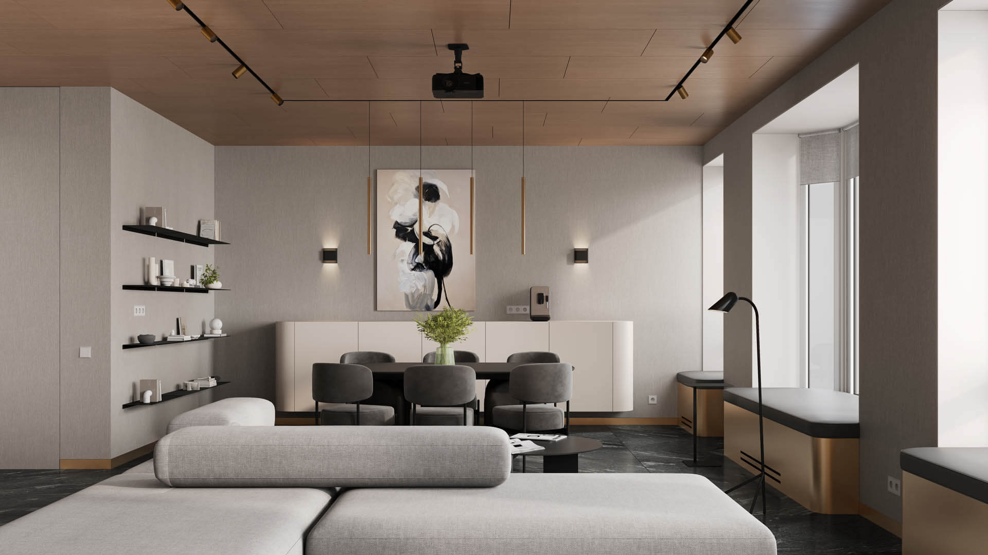Лобби жилого комплекса «GloraX Premium Белорусская» воплощает эстетический минимализм и функциональность. Панорамные окна наполняют пространство естественным светом, а элегантные текстуры натурального камня и мрамора создают атмосферу уюта и роскоши. Визуальные акценты из медных элементов и дизайнерская подсветка создают гармоничное сочетание современности и классики.