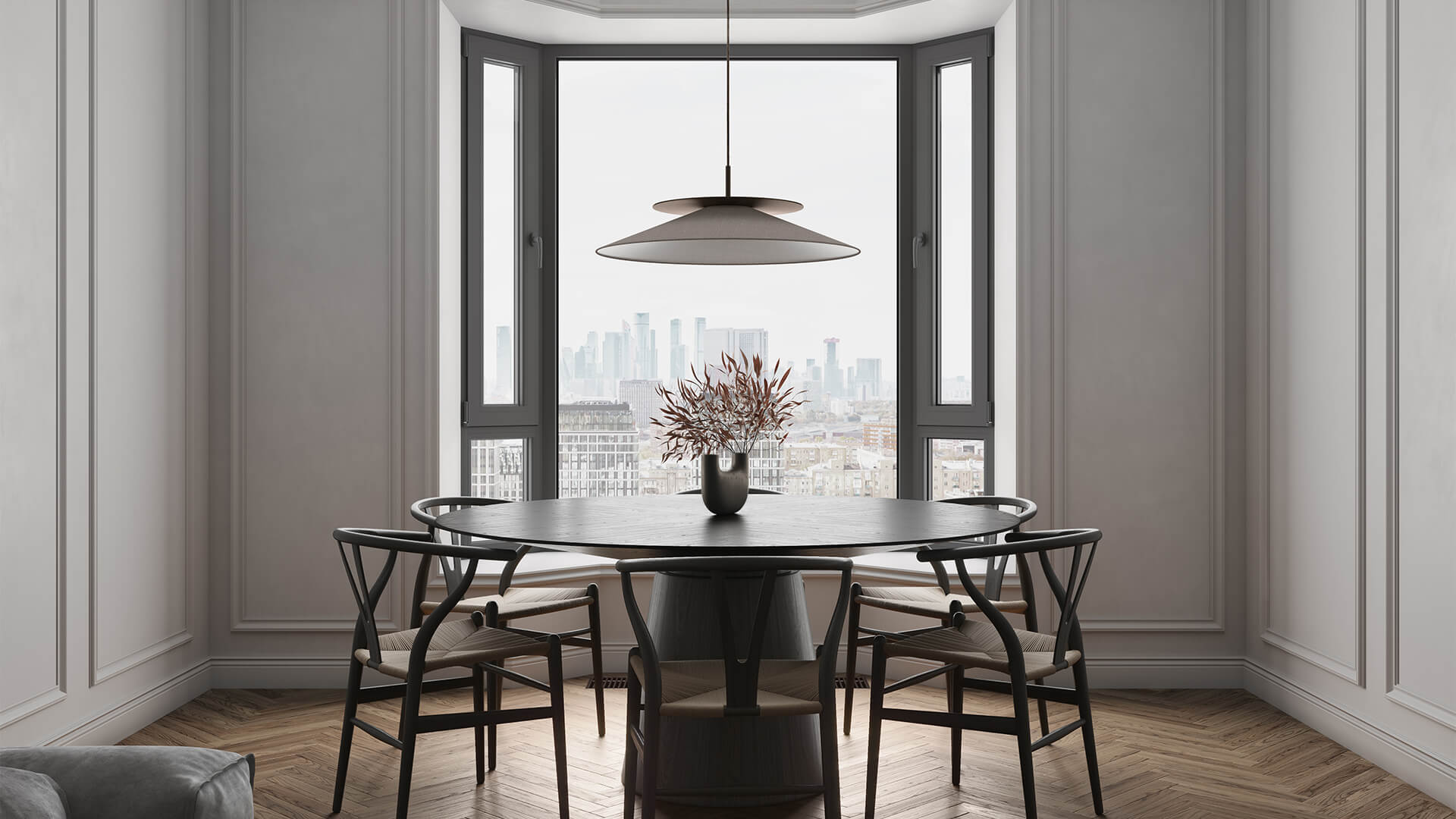 Высокие эркерные окна и использование благородных материалов, таких как натуральный камень и мрамор, добавляют изысканности и статусности зданию. Визуальные акценты на панорамные виды на Москву подчеркивают индивидуальность проекта, который смотрит в будущее, не забывая о своем прошлом.
